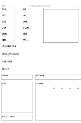 DeleteI am most keen to have something to support actual play, to minimise the need to consult the rulebook very often (a trend of modern D&D roleplaying that I really don't enjoy at all). I've come up with one that has the following on it, for Saturday night's trial game: